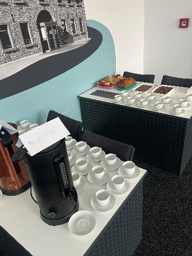 Ab 13 Uhr empfingen wir unsere Gäste vor dem Bürgersaal in einer Art Empfangskomitee, dies kam bei allen gut an. Nach einer kurzen Begrüßungsrede von unserer Auszubildenden Vanessa Greif und einigen Worten des Bürgermeisters Herrn Beck, eröffnete Oberbürgermeister Herr Zeitler nach seiner Begrüßungsrede offiziell unser Buffet.