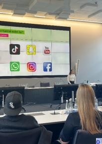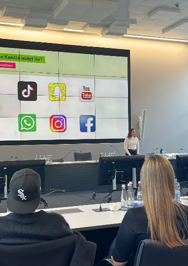 Zum Abschluss des Tages arbeiteten wir in kleinen Gruppen an Präsentationen. Jede Gruppe bekam eine These, die sie aus verschiedenen Perspektiven betrachten sollte. So versetzten wir uns zum Beispiel in die Rollen eines Azubis mit wenig Freizeit, eines Datenschutzbeauftragten, der sich Gedanken über den Umgang mit persönlichen Daten macht, oder einer Influencerin, für die Reichweite und Erfolg eine große Rolle spielen. Diese Übung war nicht nur kreativ, sondern hat auch gezeigt, wie unterschiedlich Meinungen und Lebenssituationen sein können und dass es sich lohnt, immer auch die Sicht anderer zu verstehen.