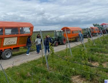 Wir fuhren weiter über die Weinberge, bis wir am zweiten Haltepunkt angekommen sind. Unterhalb der Weinterrasse wurde uns erklärt, wie die Trauben gegen Pilze und Insekten geschützt werden und wie der Wein geklärt wird. Im Anschluss wurde der nächste Wein probiert.