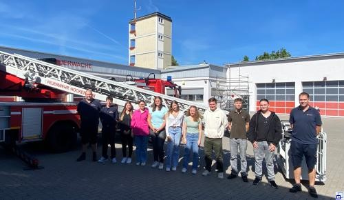 Am zweiten Kennenlerntag am Montag, den 4. September, startete Alicia Koblitz den Tag mit den letzten Infos zur Ausbildung. Im Anschluss folgte ein lustiges Spiel zum Teambuilding, dessen Aufgabe es war, Becher nach festgelegter Vorgabe aufzustellen. Das Besondere hierbei war, dass wir die Becher mit einem Gummiband, welches mit vier Schnüren befestigt war, heben und platzieren mussten und hierbei sowohl Geschick, als auch Kommunikation gefragt war. Nach intensiven und lustigen Runden die Bechertürme aufzustellen, haben wir uns auf den Weg gemacht, um Hockenheim kennenzulernen. Unsere erste Station war die Feuerwehr Hockenheim. Wir wurden rund ums Feuerwehrhaus geführt mit all seinen verschiedenen Bereichen und Fahrzeugen, mit einem abschließenden Ausblick auf die Region auf der 30 Meter hohen Drehleiter.