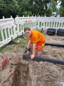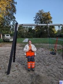 Die Maße für die Fundamente hatten wir aus dem Montageplan der neuen Schaukel ermittelt und mit Markierspray angezeichnet. Mit Hilfe des Minibaggers waren die Fundamente schnell ausgehoben und wir konnten die Schaukel montieren. Ich durfte mit ins Betonwerk fahren und wir bekamen dort 0,75m³ Fertigbeton mit der Bezeichnung C25/30. Diesen Beton mussten wir in die Löcher füllen und ab stampfen. Der Beton benötigt 14 Tage um genügend Festigkeit zu entwickeln. Danach konnten wir die Schaukelsitze montieren. Als Fallschutz verteilten wir unter der Schaukel Sand. Die Schaukel musste natürlich auch ausprobiert werden.