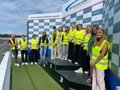 Gut gestärkt stand der nächste Programmpunkt an, ein wirkliches Highlight: Der Ausflug auf den Hockenheimring! Dort angekommen, mit Warnwesten ausgestattet, ging unsere Führung zu den zwei Tribünen, das Siegertreppchen (siehe Foto) und in die Race Control los. Da gerade eine Mercedes AMG Group-Veranstaltung war, schlugen manche Azubiherzen bei den Motorgeräuschen höher auf 😊.