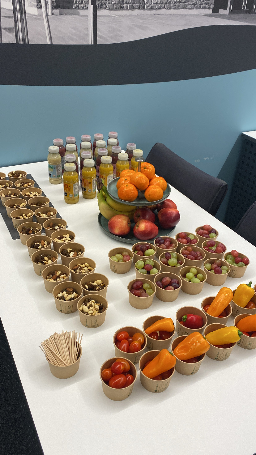 Es gab mehrere Stationen. An der ersten Station wurde der Rücken abgetastet und es wurde erklärt, welche Körperhaltung richtig ist. An der zweiten Station gab es eine Waage, man sollte seine Schuhe und Socken ausziehen und sich daraufstellen. Mit der Waage wurde ein Scan durchgeführt, bei welchem das Körperfett, der Wasseranteil und die Muskelmasse berechnet wurde. Auch der BMI (Body-Mass-Index) wurde dabei ausgerechnet. Uns wurde unser Kalorienverbrauch mitgeteilt, den man hat, wenn man z.B. nur auf der Couch liegt, sich nicht bewegt und den ganzen Tag Netflix schaut. Das ist der Bedarf an Kalorien, den man braucht, um nicht zu- oder abzunehmen. Danach gab es eine kleine Pause, wo Snacks, Getränke und ein paar Süßigkeiten zur Verfügung gestellt wurden. Die Firma Barmer verabschiedete sich bei uns recht herzlich.