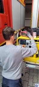 Felix Schäfer prüft die elektrischen Geräte an einem Feuerwehrfahrzeug.